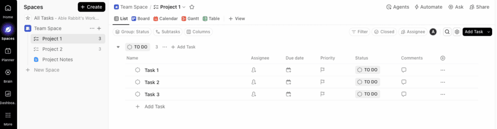 - Lists: Organise tasks within folders and spaces. Think of them as “to-do categories” for projects (e.g., Marketing Campaign, Blog Posts, Sprint Backlog).