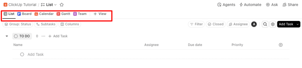 You can also try using the Board View (similar to Kanban boards like Trello). As you get comfortable, you can try Calendar View for scheduling or Gantt Charts for project timelines. Switching between views helps visualise work in the way that suits you best. You can change the view by choosing any of the tabs highlighted in the screenshot below.