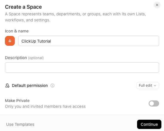 - You can give a name, choose a colour and an icon, as well as a description for your new Space. Optionally, you can choose to make it private.