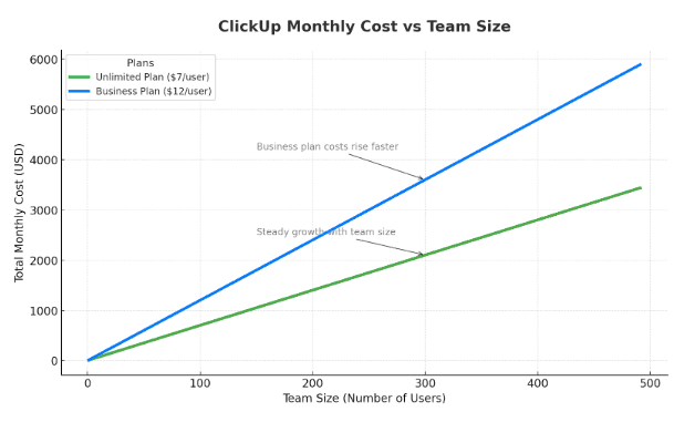 The graphic below provides a clean, visual representation of the core per-user costs for the two main paid tiers: Unlimited and Business. We did not use the graph to plot ClickUp’s Enterprise plan costs, as it is a custom quote.