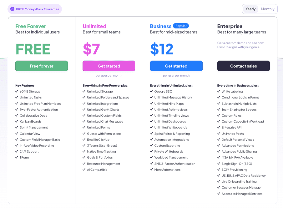 It’s built to work just as well for a solo freelancer as it is for a massive global company. The main idea is simple: you only pay for the features you actually need. Look at the screenshot from ClickUp’s official pricing page.