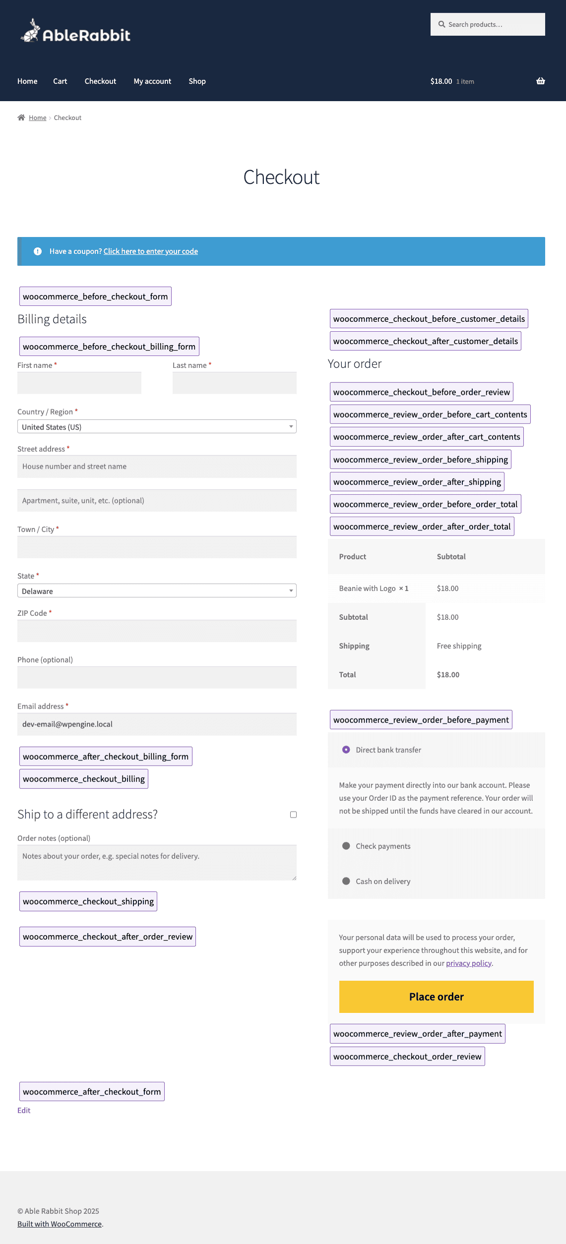 Complete and updated lists of checkout page hooks are available in WooCommerce developer documentation.